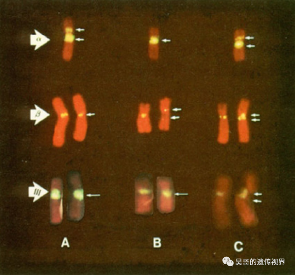 原位杂交的结果提示我们,在细胞遗传学水平看起来没什么差别的inv(9),实际上远比我们想象的要更加复杂,只不过用常规的G显带、C显带方法无法显示而已。