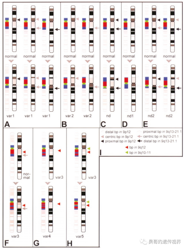 根据断裂位点发生的位置不同,即9p12的近端、中间和远端以及9q13-21.1的近端、中间和远端,简单排列组合下理论上可以得出9种不同的9号倒位模式;这还没完,如果考虑到9q12和9q10-11的断裂,倒位的模式可就更多了,见下图(再次头晕警告)。大家感兴趣可以看原文。