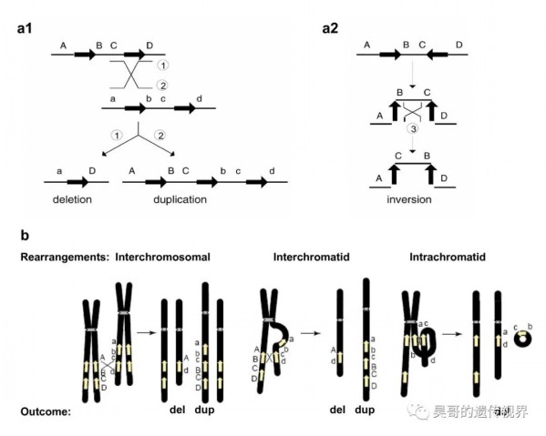 非等位同源重组,顾名思义,就是发生在非等位片段上的同源重组,例如下面a1图中,ABCD和abcd分别位于两条同源染色体,正常情况下应该是AB跟ab配对,CD跟cd配对重组,但是由于AB和CD序列的相似性,重组时发生了错位,导致CD片段和ab片段发生了重组,最终导致片段的缺失和重复。这种重组可以发生在不同染色体间、姐妹染色单体间、同一条染色体内,简而言之,只要是有相似序列的,就有可能发生NAHR。而且不同情况下的NAHR还可以导致不同的结构异常形式,例如在a2中,同一条染色体内的NARH可以导致染色体的倒位。在图b中还能形成环状染色体。由于基因组内广泛存在着各种各样的重复序列,因此NAHR是导致染色体结构异常的最基础的机制之一[另外还有非等位同源末端连接(NHEJ)和复制叉停滞和模板转换 (FosTes),感兴趣可以自行搜索一下]。