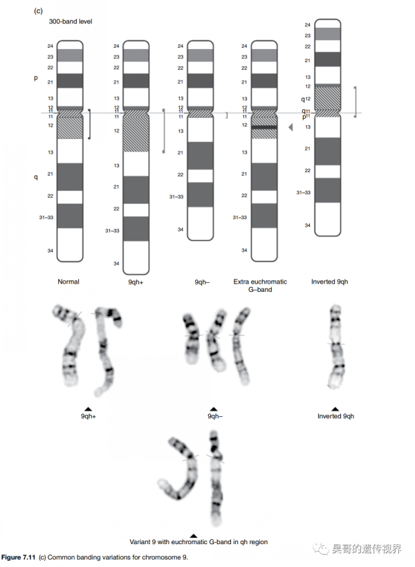 9号染色体相关的多态比较多,比如常见的9qh+,9qh-,或者说9qh中又插入一条深带(如下图),这些多态究其原因都与9号长臂的异染色质有关。
