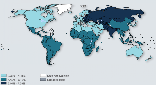 图1. 耳聋在全球范围的发病率(WHO 2013)